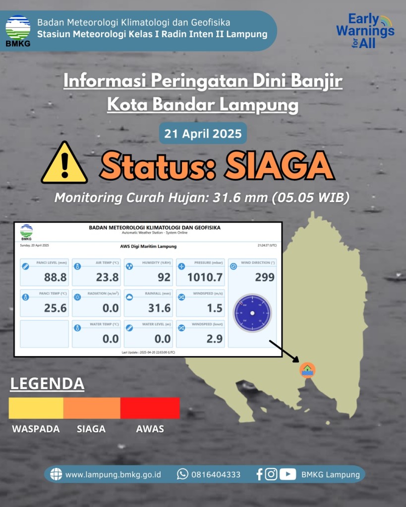 Merapah.com — Badan Meteorologi, Klimatologi, dan Geofisika (BMKG) Lampung mengeluarkan peringatan dini terkait potensi banjir yang dapat terjadi di wilayah Kota Bandar Lampung, Senin, 21 April 2025. Curah hujan tercatat cukup tinggi, yakni sebesar 31,6 mm pada pukul 05.05 WIB. Oleh karena itu, status kewaspadaan ditetapkan menjadi Siaga. Selain itu, peringatan siaga banjir di Bandar Lampung tersebut harus menjadi perhatian bersama.