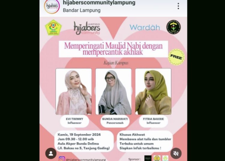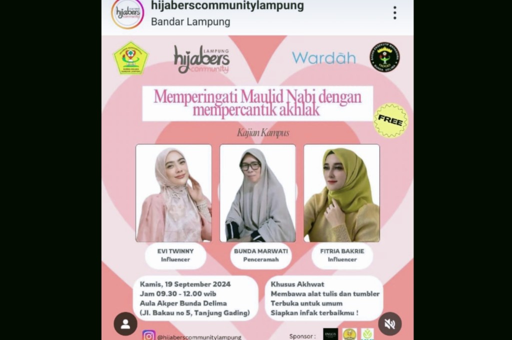 Merapah.com – Hijabers Community Lampung (HCL) akan menggelar kajian kampus bertema “Memperingati Maulid Nabi dengan Mempercantik Akhlak”. Kolaborasi ini melibatkan Akper Bunda Delima, Wardah, dan HCL sebagai penyelenggara. Acara akan berlangsung pada Kamis, 19 September 2024, pukul 09.30–12.00 WIB di Aula Akper Bunda Delima, Tanjung Gading.