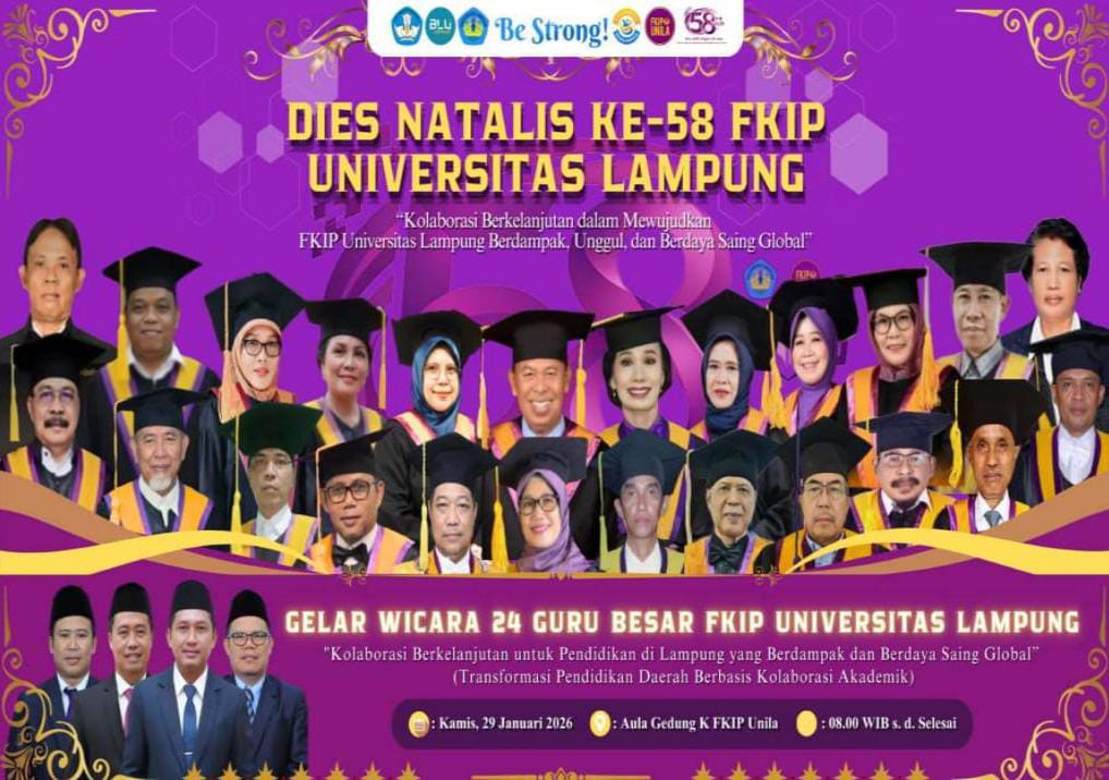 Merapah.com, Bandar Lampung – Fakultas Keguruan dan Ilmu Pendidikan (FKIP) Universitas Lampung (Unila) akan menggelar Gelar Wicara Guru Besar FKIP Unila dalam rangka Dies Natalis ke-58 FKIP Universitas Lampung, Kamis, 29 Januari 2026, di Gedung Aula K FKIP Unila.