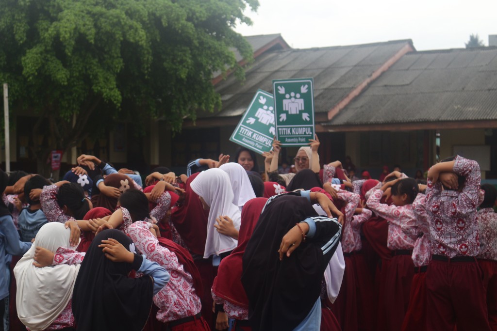 Para siswa mengikuti simulasi dengan antusias dan aktif mempraktikkan instruksi yang diberikan oleh pihak BPBD dengan dukungan dari Mitra Bentala.