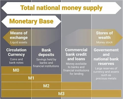 1. M0 (Basis Moneter/Uang Inti): Uang fisik (uang kertas dan logam) + cadangan kas perbankan di bank sentral. Ini adalah komponen paling dasar.