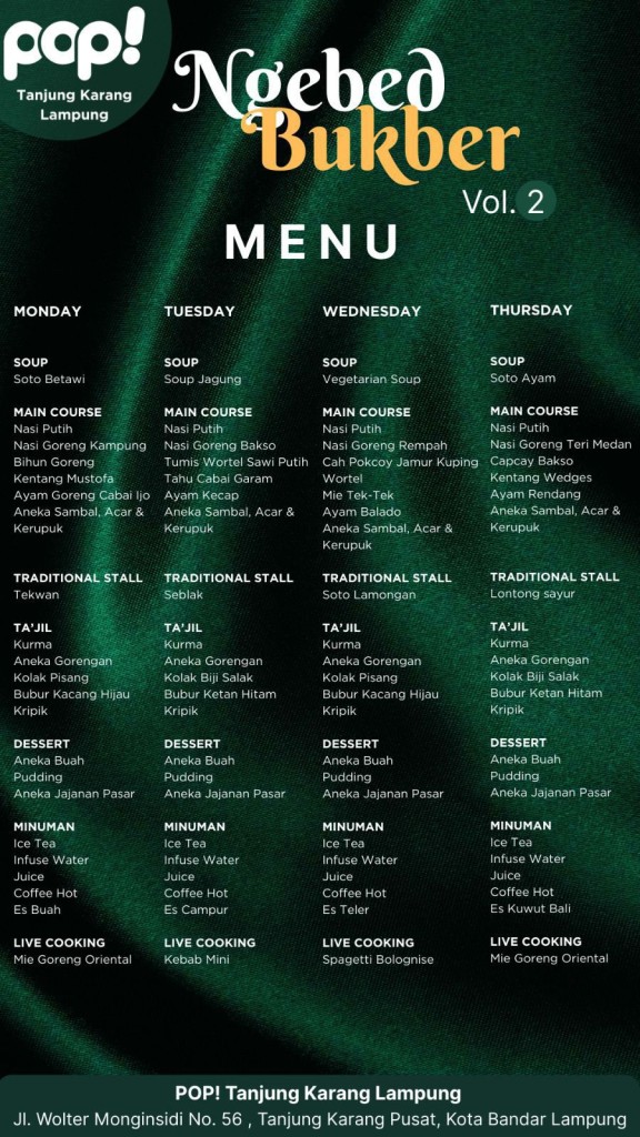 Salah satu program unggulan yang ditawarkan adalah buka puasa buffet bertajuk Ngebed Bukber – Vol.2. Program ini merupakan kolaborasi antara POP! Hotel Tanjung Karang dengan Kopi Oey Lampung. Para tamu dapat menikmati hidangan sepuasnya dengan harga Rp98.000 per orang untuk dewasa dan Rp49.000 per orang untuk anak-anak di bawah usia 10 tahun.